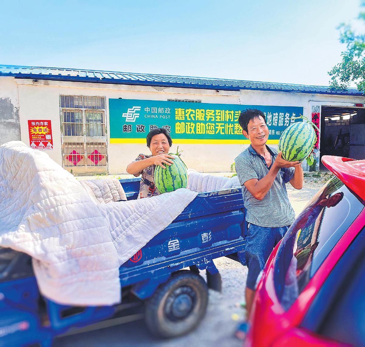 在济宁市泗水县邮政分公司设立的服务点,西瓜种植户准备过磅装车。□孙慧芹 摄