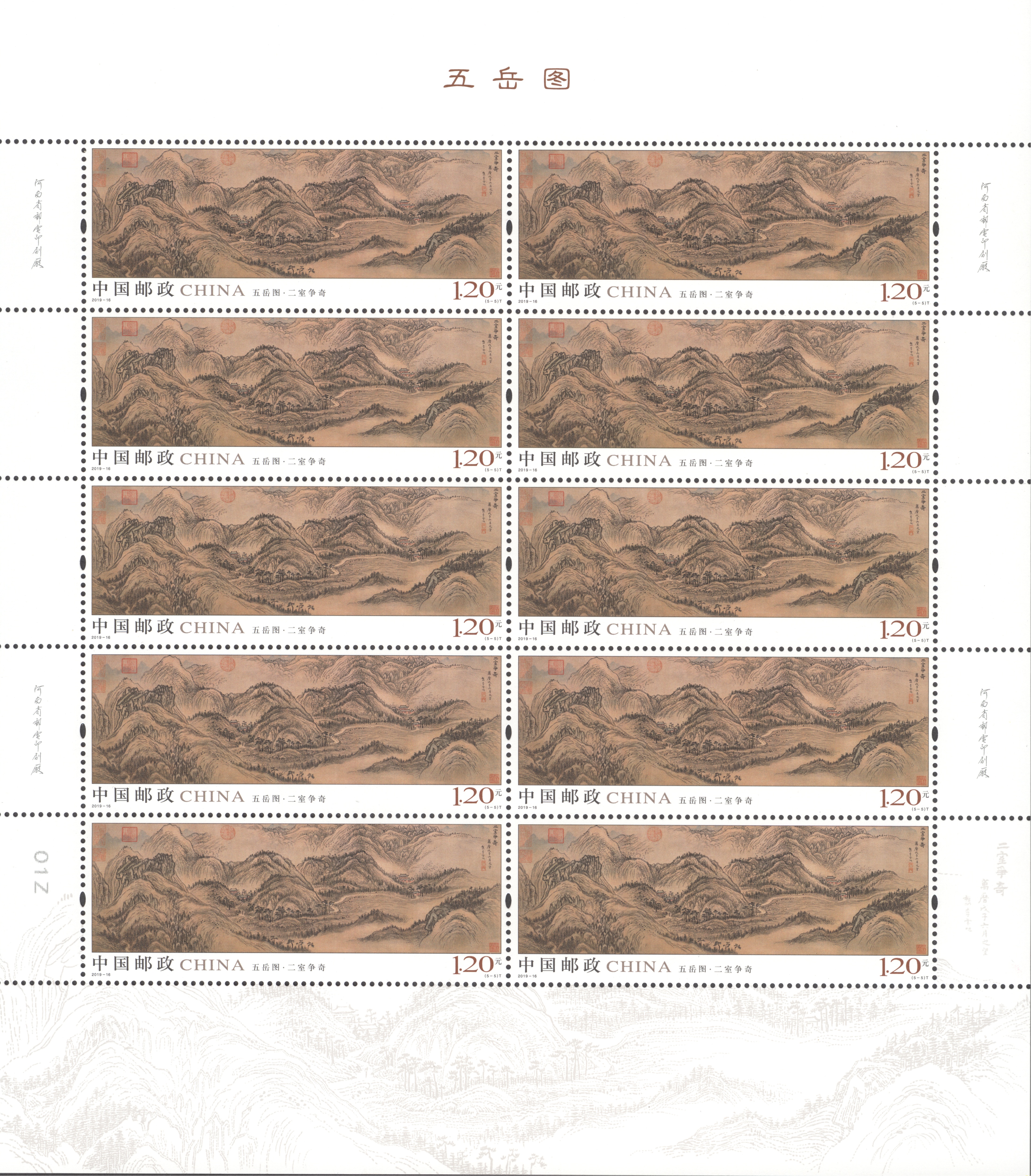 中国邮政定于2019年8月3日发行《五岳图》特种邮票1套5枚,小全张1枚。详情如下: