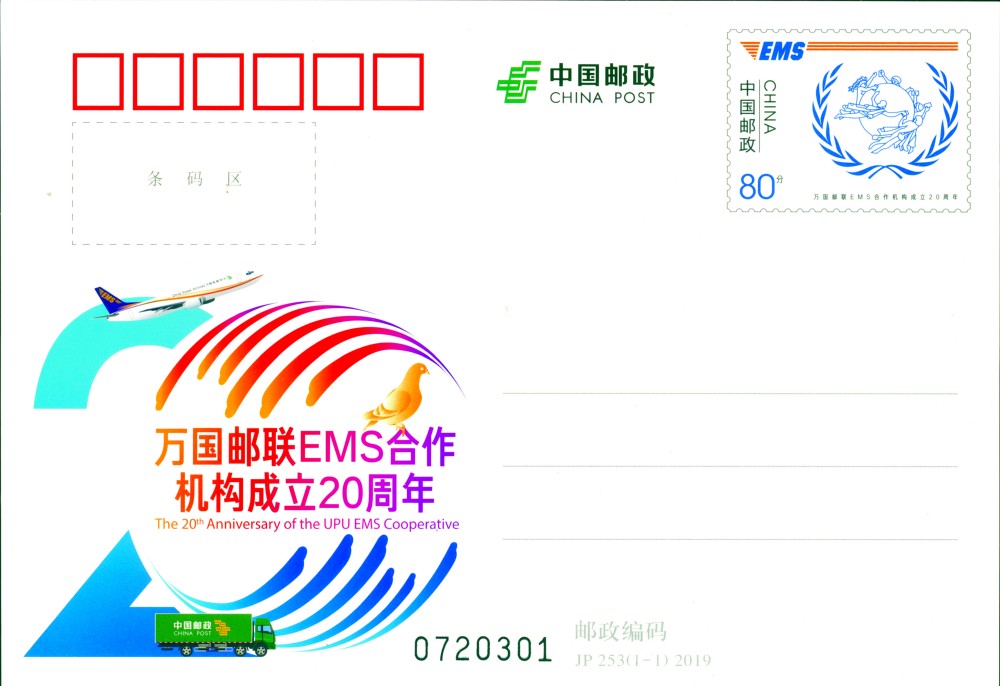 中国邮政定于2019年9月10日发行《万国邮联EMS合作机构成立20周年》纪念邮资明信片1套1枚。详情如下: