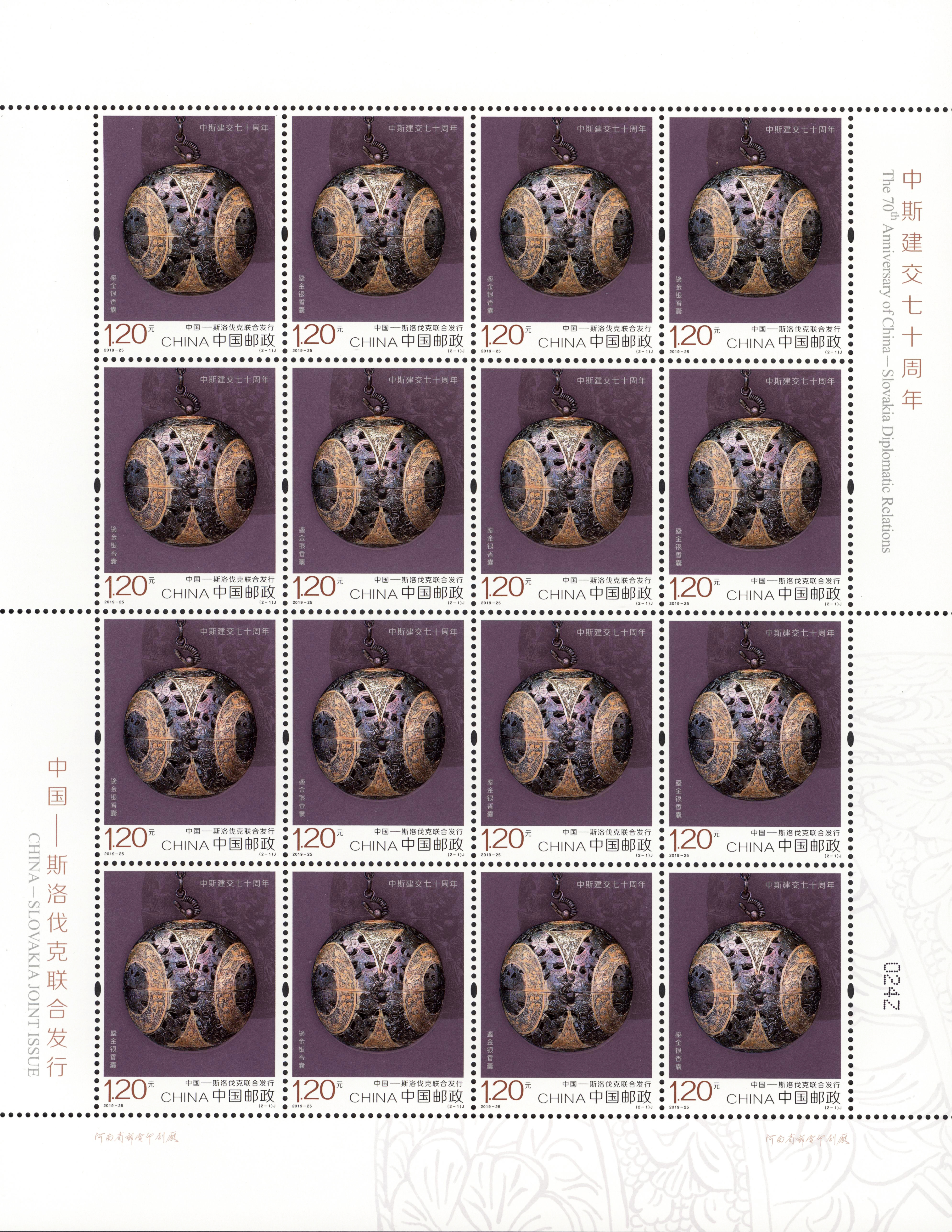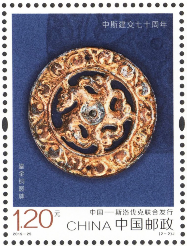 中国邮政定于2019年10月6日发行《中斯建交七十周年》纪念邮票1套2枚(与斯洛伐克联合发行),邮票图案名称分别为:鎏金银香囊、鎏金铜圆牌。全套邮票面值为2.40元。