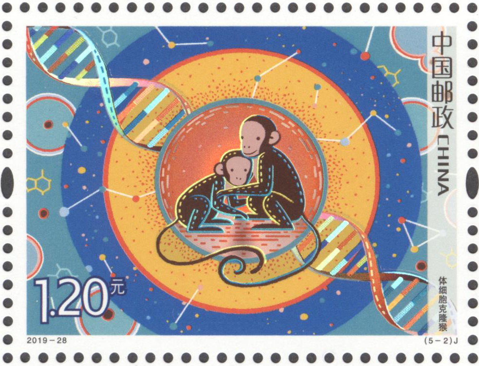 邮票设计采用手绘插画的表现手法,构图简洁明快,色彩组合对比浓烈,视觉风格鲜明,具有一定的超现实感。第一图表现探月工程“嫦娥四号”着陆器、“玉兔二号”巡视器、“鹊桥”中继星等;第二图表现了于2017年11月27日、12月5日诞生的两只克隆猴“中中”和“华华”;第三图以高速公路寓意同时具备铁磁性、体绝缘性、拓扑非平庸性的磁性掺杂拓扑绝缘体薄膜,配合能带图,展现电子在拓扑绝缘体薄膜中高效运动的情景;第四图通过表现大脑、肠道等人体内环境,以及海藻、药物胶囊、化学结构式等图案,体现出GV-971新颖的药物作用模式与独特的多靶作用特征;第五图描绘了强流质子直线加速器、快循环同步加速器、靶站的外部造型,悬浮在空中的圆形球体表示散裂中子源在材料科学、物理学、生命科学、新能源等领域的广泛应用和广阔前景。