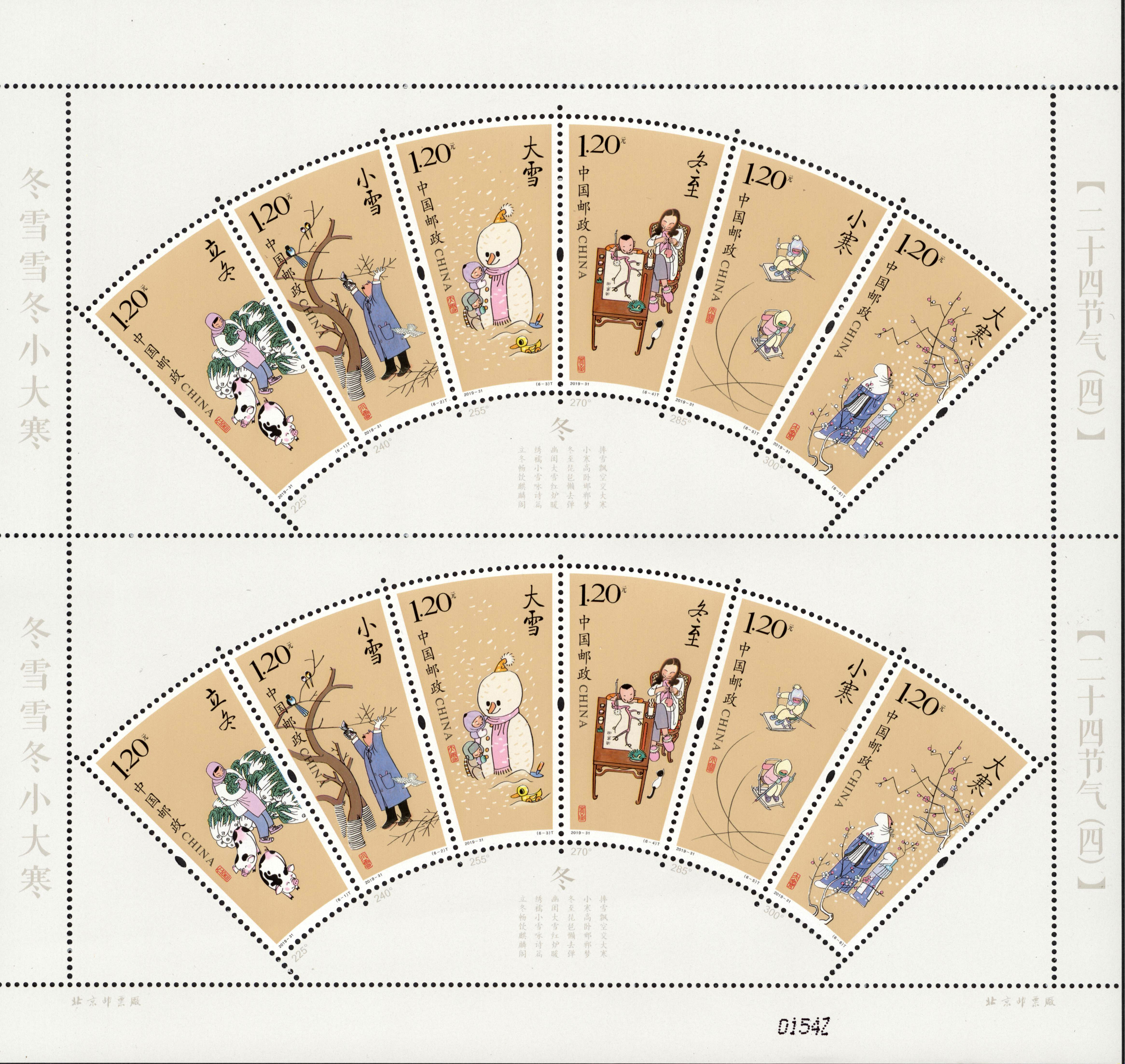 二十四节气是我国古代根据一年中太阳在天球黄道圆上位置划分出来的24个具有时节意义的位置与日期,每个节气约15天,是中国人认知天象、物候、时令和大自然变化规律的知识体系与社会实践,是中华民族传统文化的重要组成部分。2016年,二十四节气被列入联合国教科文组织人类非物质文化遗产代表作名录。本套邮票为自2015年开始发行的《二十四节气》系列邮票第四组,表现冬天的六个节气。经过了春天的草长莺飞、桃红柳绿,夏天的阳光灿烂、浓荫匝地,秋天的金风送爽、硕果累累,便迎来了飞雪凝霜、寒风刺骨的冬天。这六个节气分别是:立冬、小雪、大雪、冬至、小寒、大寒。