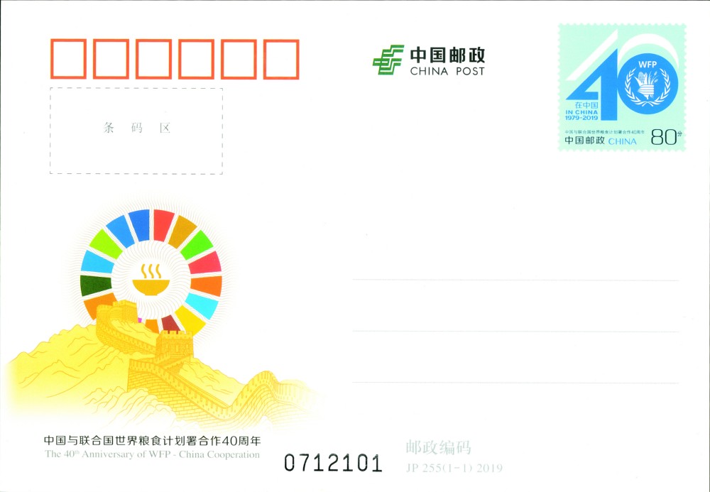 中国邮政定于2019年12月19日发行《中国与联合国世界粮食计划署合作40周年》纪念邮资明信片1套1枚。详情如下: