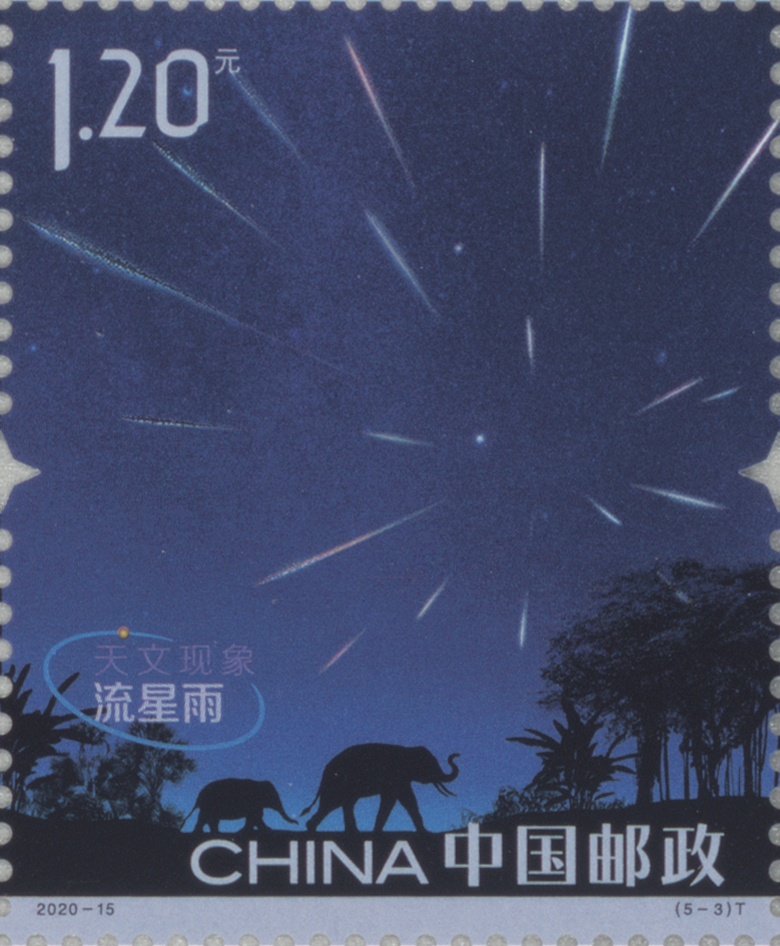星际空间的微细尘埃以高速闯进大气层,与大气分子磨擦生热而产生白炽光形成流星,流星划过天空会出现的一条短暂的亮带。邮票第三枚“流星雨”以对冲的角度再现绚丽的流星雨场面。