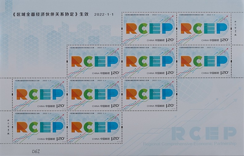 中国邮政定于2022年1月1日发行《<区域全面经济伙伴关系协定>生效》纪念邮票1套1枚。详情如下: