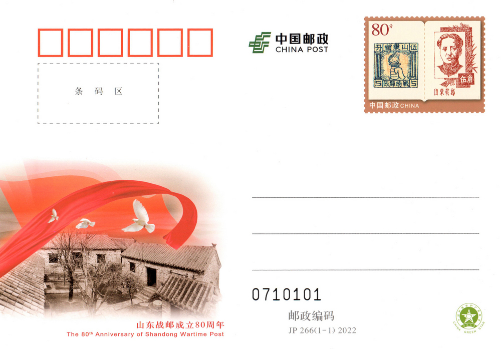 中国邮政定于2022年2月7日发行《山东战邮成立80周年》纪念邮资明信片1套1枚。详情如下: