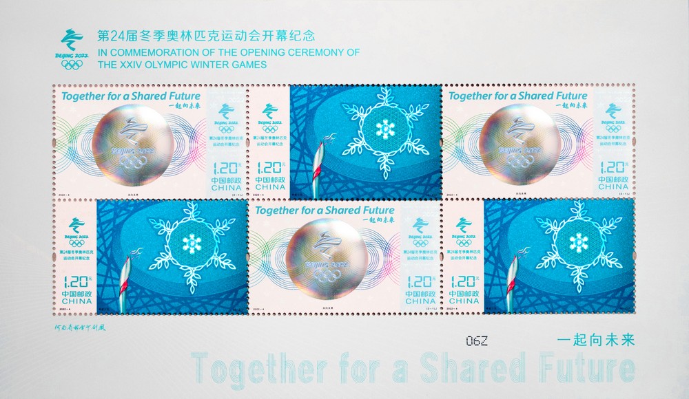 中国邮政定于2022年2月4日发行《第24届冬季奥林匹克运动会开幕纪念》纪念邮票一套2枚,邮票图案名称为共向未来、希望之光。全套邮票面值2.40元。邮票计划发行数量为1150万套。