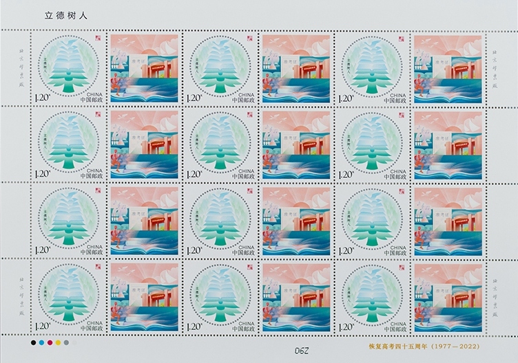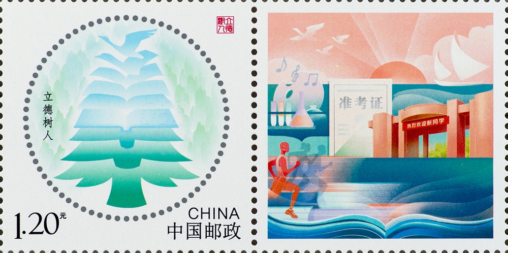 该套邮票由陈楠设计。陈楠,清华大学美术学院教授、博士生导师,曾设计《孔子学院》《中国红十字会成立一百周年》《长江三峡工程·发电》等纪特邮票以及《清华大学》《北京协和医院》个性化服务专用邮票。邮票主图以打开的书本组成树木造型,体现“立德树人”主题,色彩蓝绿交织、清新靓丽;附图将海浪、飞鸟、旭日、帆船等图形元素与书本、准考证、校门等元素符号相结合进行概念化设计,寓意一代代青少年志存高远、勤学求知、砥砺品格、接续奋斗,在拼搏和奉献中实现人生价值,努力在实现中华民族伟大复兴中国梦的生动实践中放飞青春梦想。