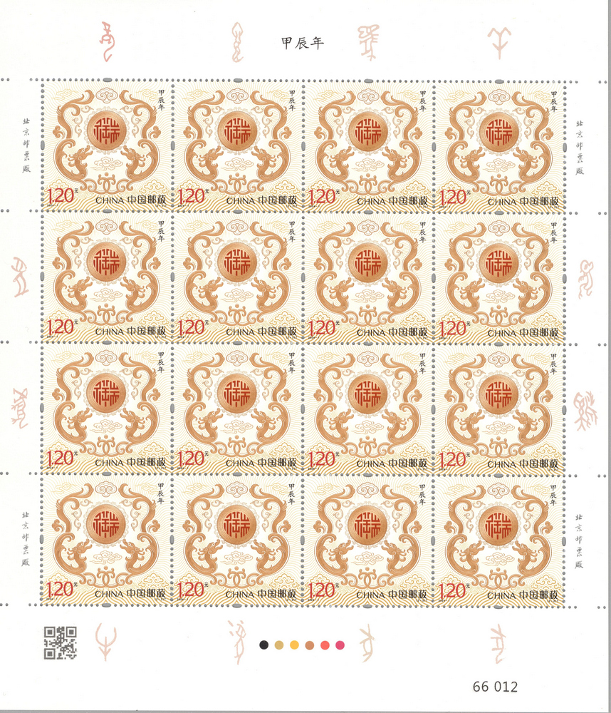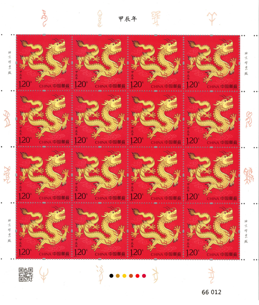 在十二生肖中,龙是神兽,象征尊贵和力量,在民间寓意吉祥好运。邮票一套两枚,图案汲取中国历代经典龙形象中的文化基因,结合生肖文化特征和邮票艺术特点,用平面装饰的设计语言诠释出新的时代、新的历史时期的龙形象,彰显出新时代自信、自强的文化底蕴,画面简洁明快,色彩喜庆吉祥,寓意祥瑞美好。邮票一图名为“天龙行健”,展现了一条昂首奋发的金龙,象征蓬勃向上、自强不息的精神风貌。其形象和姿态源自故宫九龙壁,灵动宛转而不失敦厚威严。金龙身旁饰以寓意吉祥的火焰和祥云纹样并衬以中国红背景,展现出吉庆祥和、纳福迎祥的美好图景;二图名为“辰龙献瑞”,邮票图案源于中国传统吉祥纹样“祥龙拱璧”。画面整体与邮票外形构成“天圆地方”的格局,和谐而庄重。中央玉璧有“祥瑞”二字合文,寓意祥和圆满、福瑞安康。上方的如意纹样传递出和顺致祥之意,下方的水纹、云纹与龙形象共同展现了龙腾四海的宏阔景象,表达出风调雨顺、国泰民安的美好愿望。两枚邮票主打红、金、黑经典三色,体现出了大气、贵气、瑞气和喜气,一动一静、相得益彰。该套邮票由王虎鸣设计,北京邮票厂有限公司采用胶雕套印工艺印制。